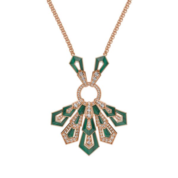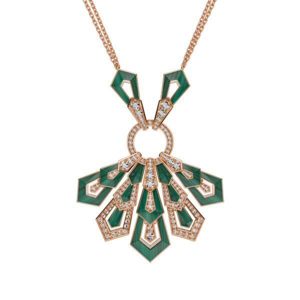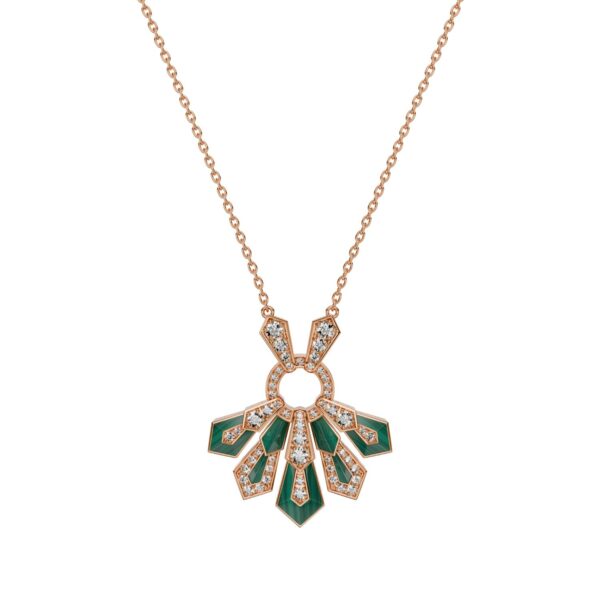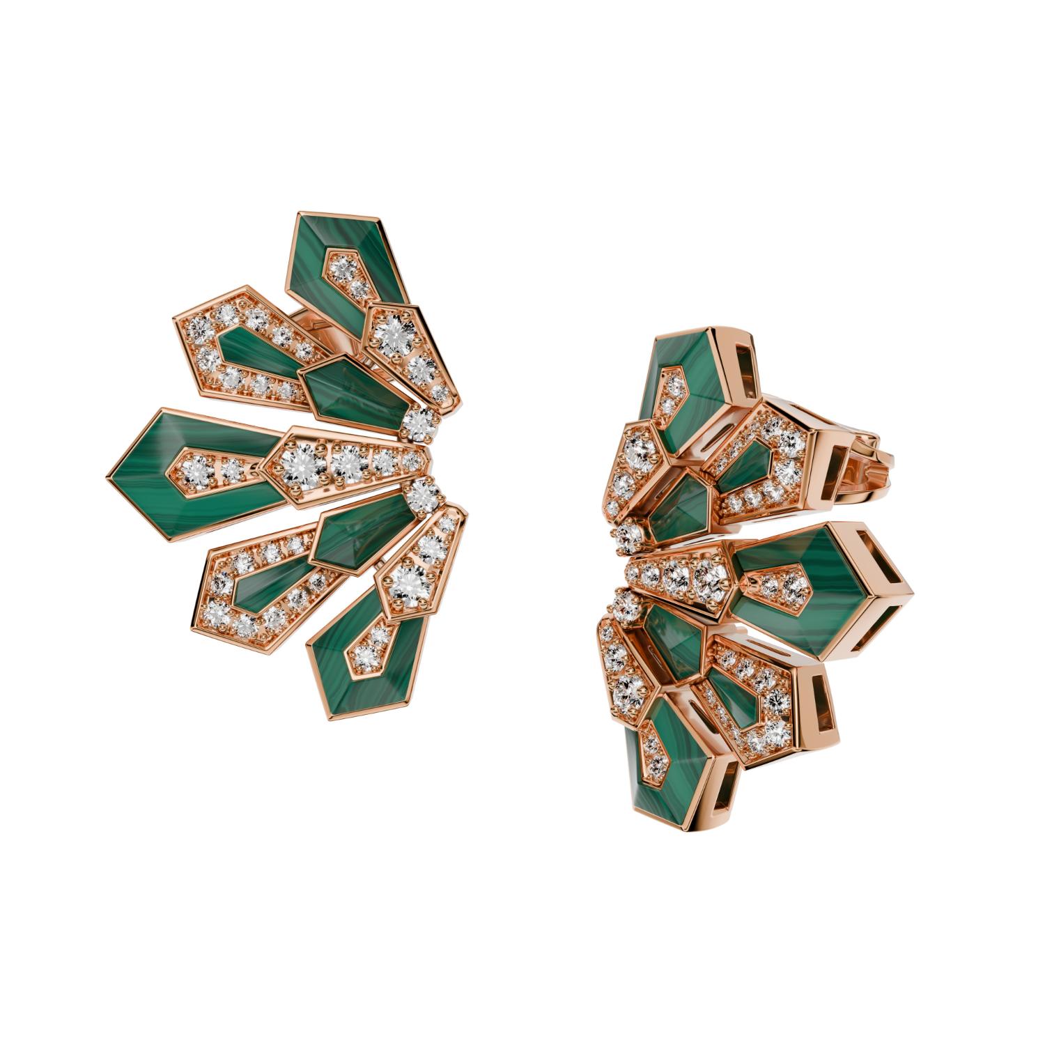 Earrings in 18K rose gold, malachite and diamonds. Diamond quality G – H color, VS.