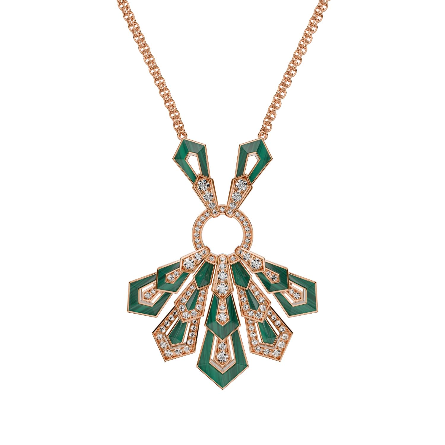 Pendant in 18K rose gold, malachite and diamonds. Diamond quality G – H color, VS.