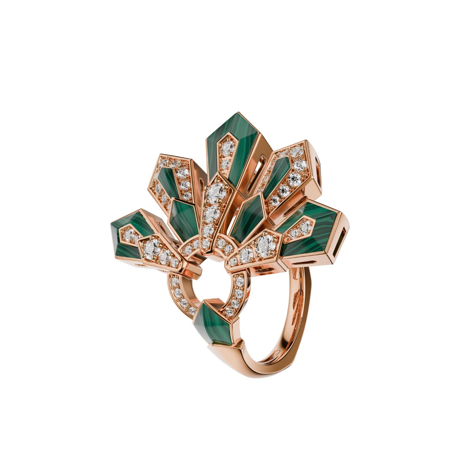 Ring in 18K rose gold, malachite and diamonds. Diamond quality G – H color, VS.